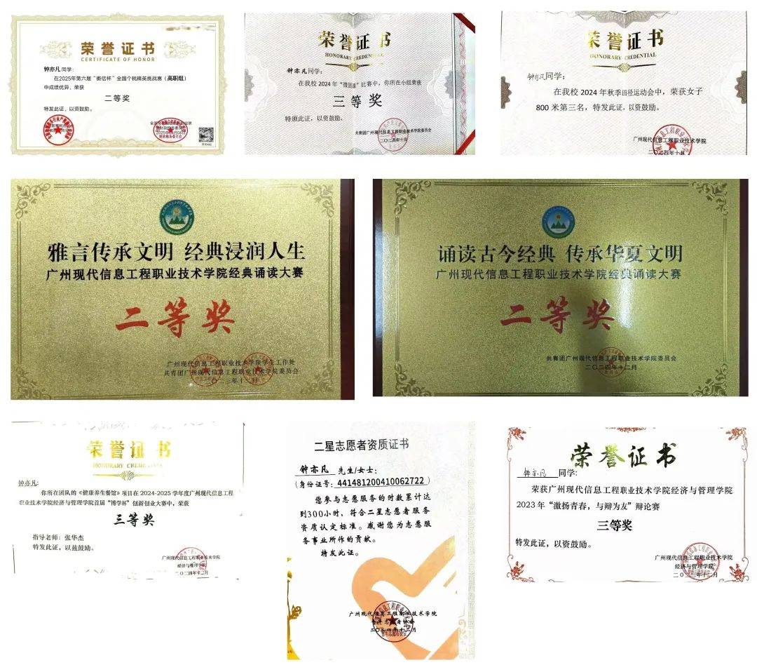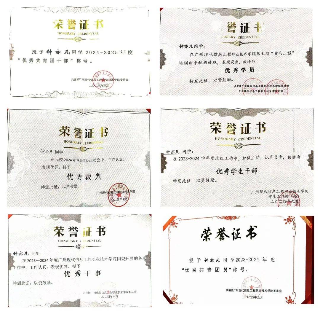 在担任学生干部期间,她始终秉持着服务同学的宗旨,认真履行职责。她牵头组织校级团支部书记培训班,策划开展团务知识考核与竞赛活动。在参加2024年广东省高校学生团支部书记培训班微团课大赛中,钟亦凡与成员们的佳作获评“品牌项目”。在暑期“三下乡”社会实践活动中,她担任志愿服务队队长,带领团队深入乡村学校和社区开展国家资助政策宣传,共收到两封表扬信。