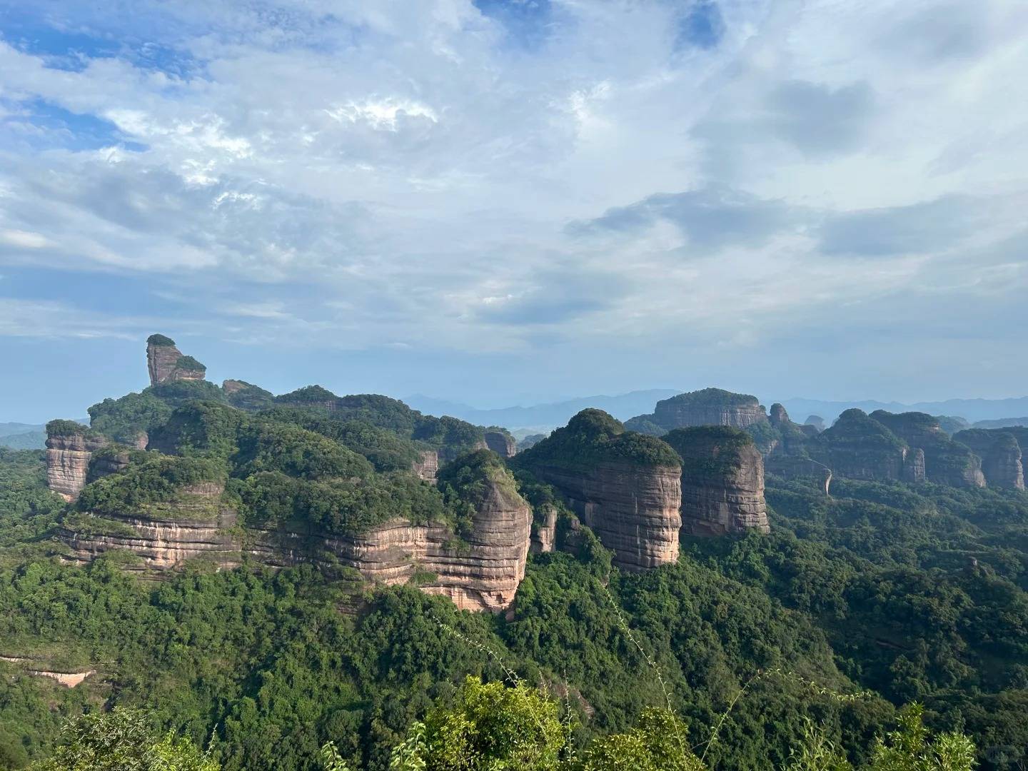 阳元石是丹霞山的标志性景观之一,高约 28 米,因其形似男性生殖器而得名,是大自然经过 30 万年风化侵蚀形成的奇特地貌。站在观景台拍摄阳元石全景,能看到它与背后的九九天梯相互映衬 —— 九九天梯是一条陡峭的石阶路,沿着山体向上延伸,仿佛 “通往云端”,这样的画面既有自然的雄奇,又有人工的震撼。而导游会介绍阳元石的形成过程,比如亿年前这里曾是河流,水流携带的泥沙沉积形成红色岩层,后来经过地壳抬升、风化侵蚀,最终形成如今的造型,让团队成员对 “自然鬼斧神工” 有更科学的认知。